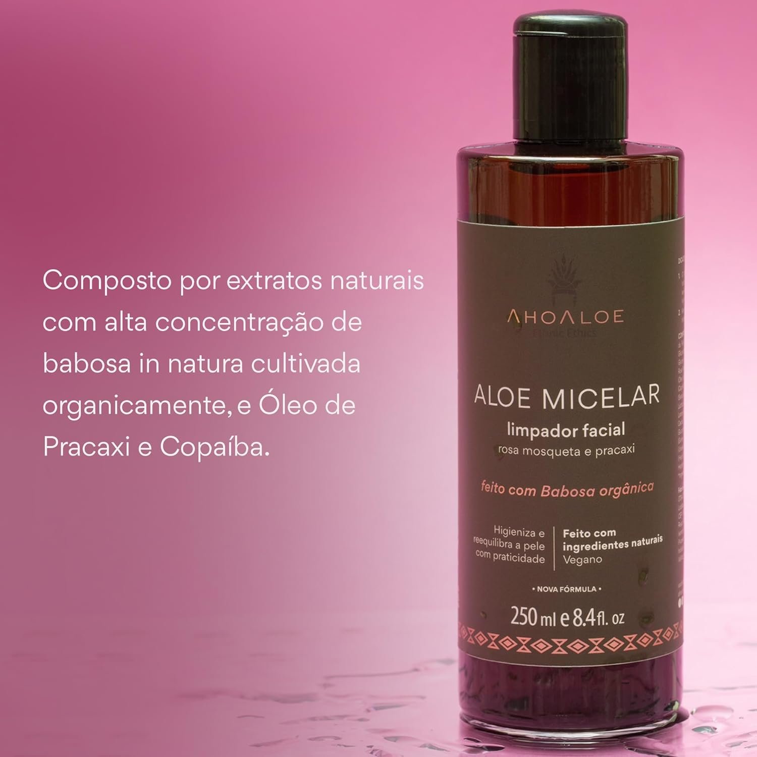 AHOALOE Água Micelar Demaquilante Aloe Micelar – Limpador Facial – Babosa, Rosa Mosqueta e Pracaxi – Ingredientes Naturais – Higieniza, Hidrata e Equilibra a Pele – Todos os Tipos de Pele 250ml