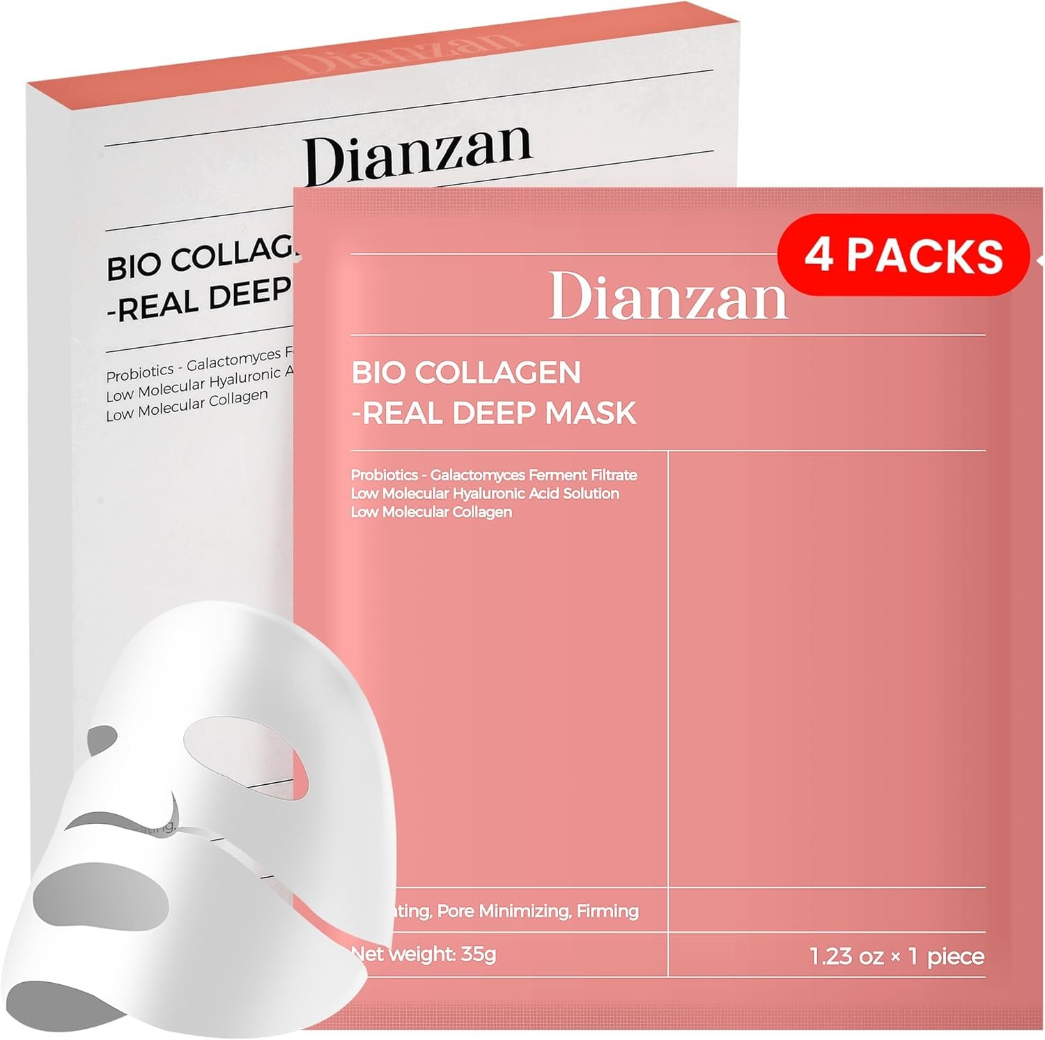 Dianzan Máscara Facial Hidratante Noturna Bio-Collagen Real, Com Ácido Hialurônico E Colágeno, Fórmula Coreana Para Pele Seca E Sensível – Fecha Os Poros, Firma A Pele, Reduz Linhas Finas, 35G X 4