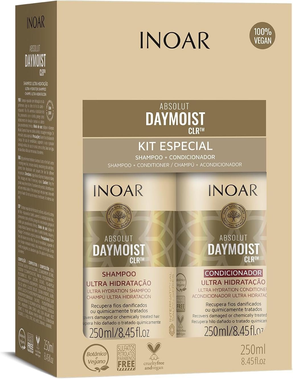 O Inoar Daymoist Kit Duo é especialmente formulado para cabelos danificados, ressecados e sem brilho. Ele ajuda a restaurar a hidratação e a vitalidade dos fios, sendo ideal para quem usa muito secador, chapinha ou faz processos químicos como tintura e alisamento.