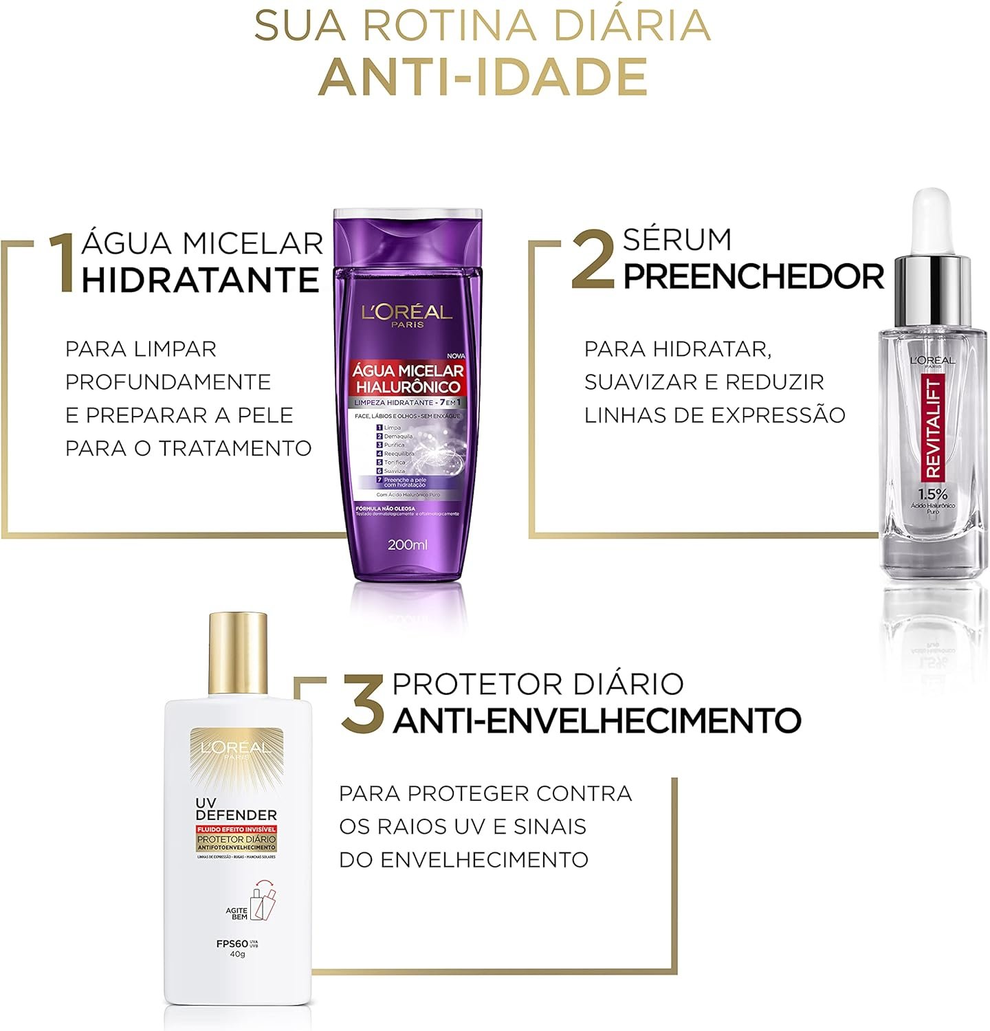 A minha rotina de skincare com o **Kit Tratamento L’Oréal Paris Revitalift Hialurônico: Sérum + UV Defender Fluido** é bem simples: