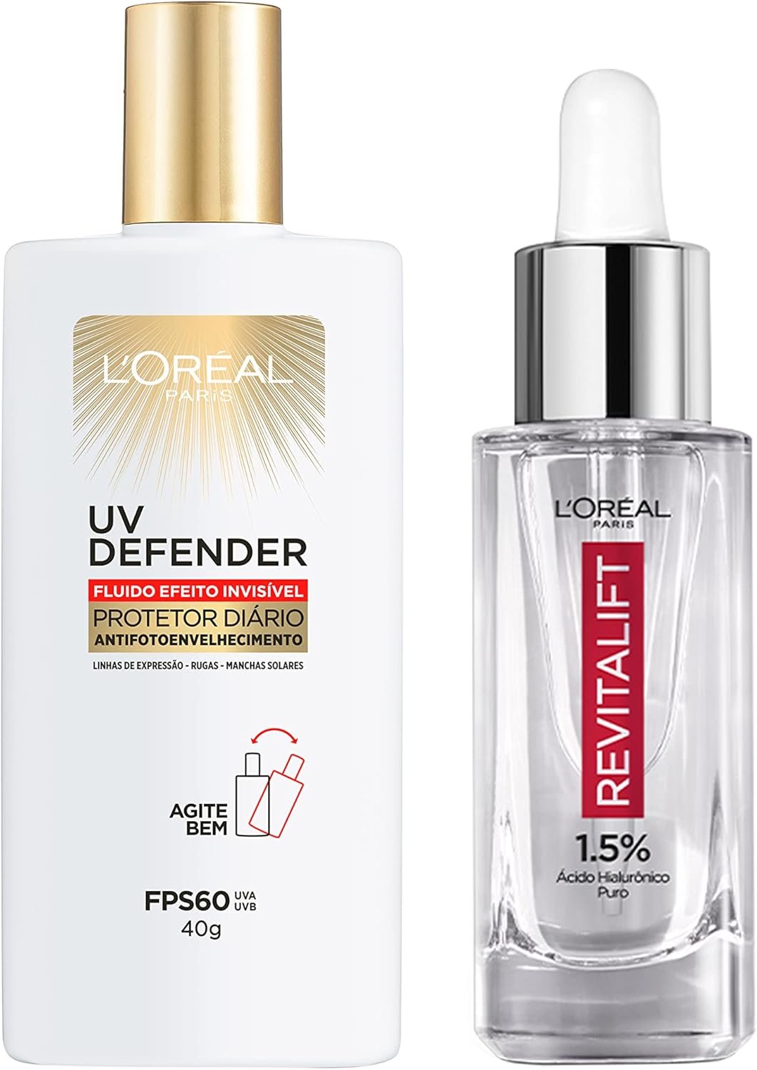 O **Kit Tratamento L’Oréal Paris Revitalift Hialurônico: Sérum + UV Defender Fluido** é um combo pensado para quem busca hidratação intensa e proteção solar, tudo em uma rotina simplificada. Ele promete preencher linhas finas, melhorar a textura da pele e proteger contra os raios UVA/UVB, prevenindo o envelhecimento precoce. Afinal, quem não quer uma pele radiante e protegida, né?