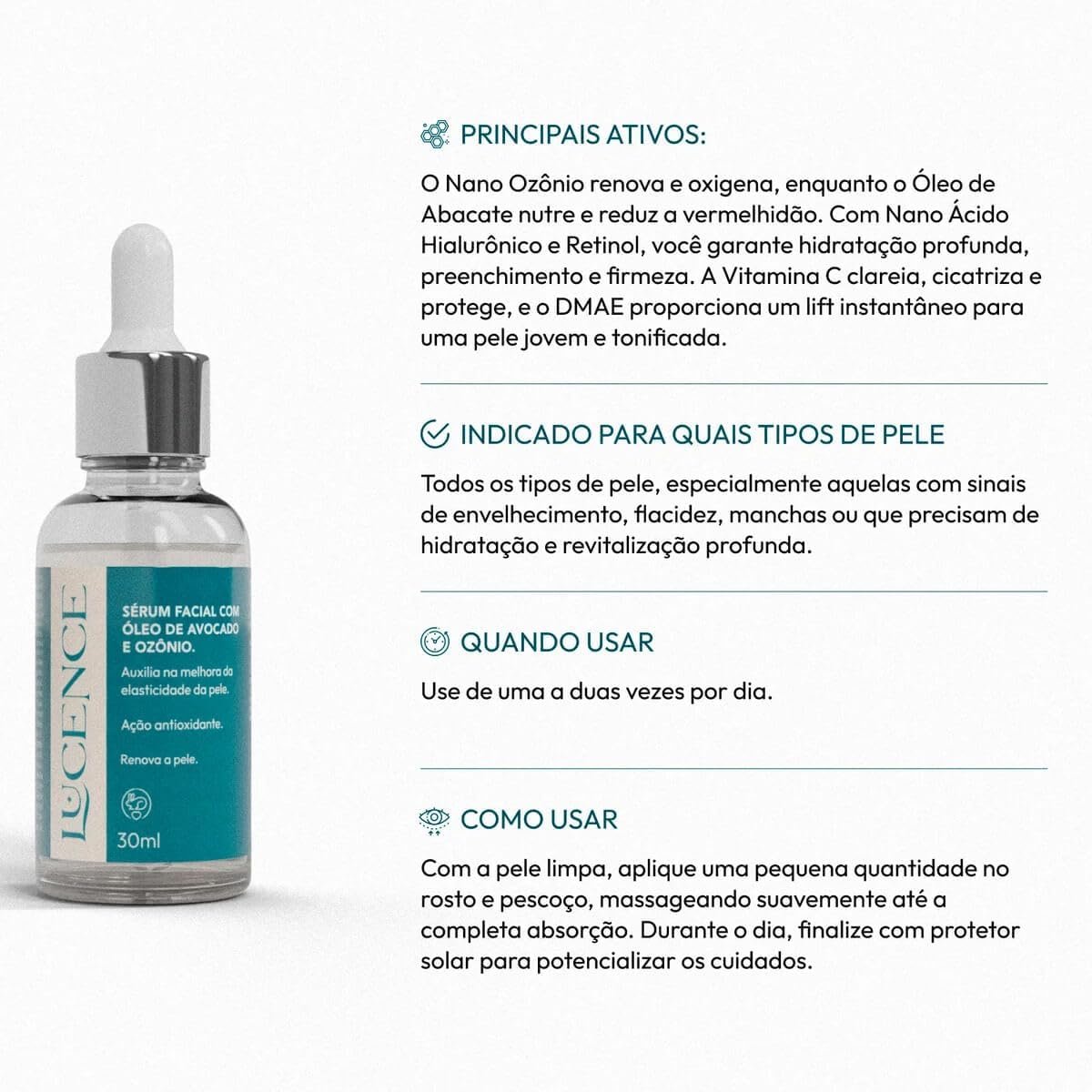 O Lucence Sérum Facial 30ml Skincare é um sérum desenvolvido para proporcionar hidratação, luminosidade e, segundo a marca, combater os sinais de envelhecimento da pele. Ele promete uma pele mais radiante, viçosa e com aspecto mais jovem. Basicamente, ele entra na sua rotina de beleza como um tratamento complementar, potencializando os efeitos do seu hidratante e protetor solar.