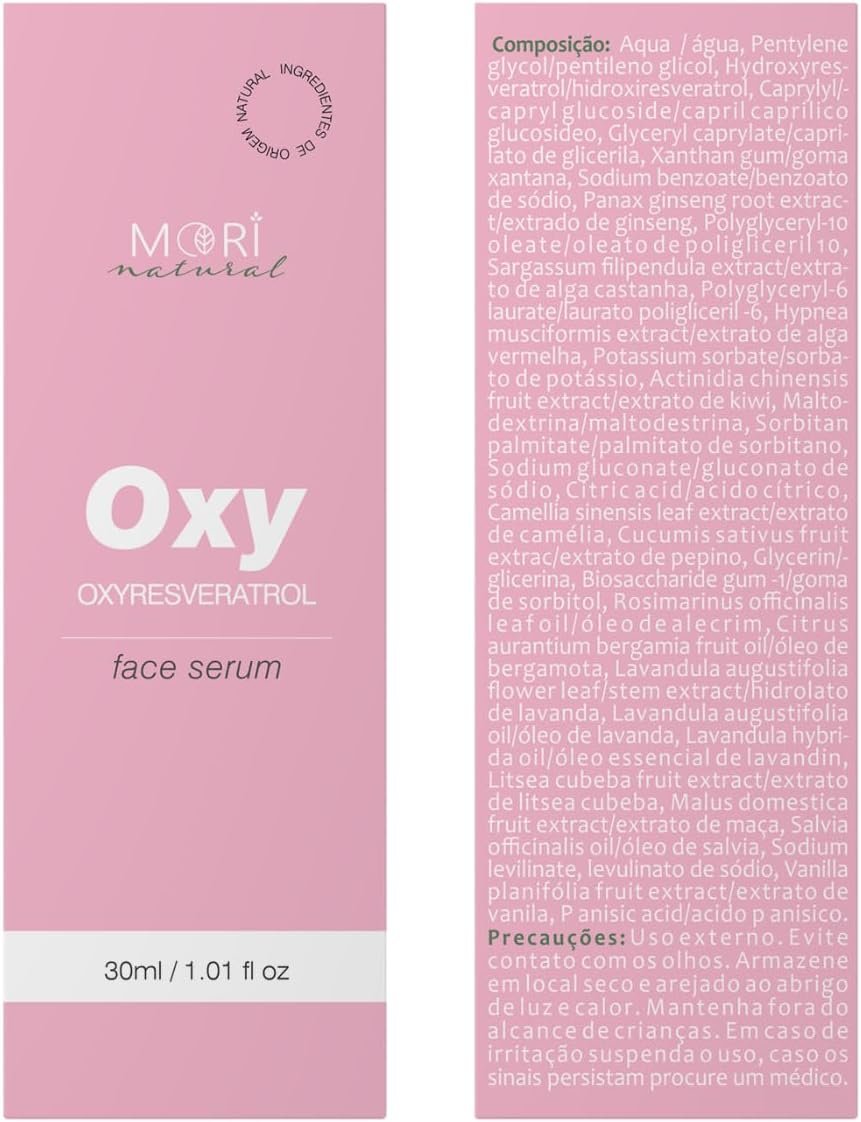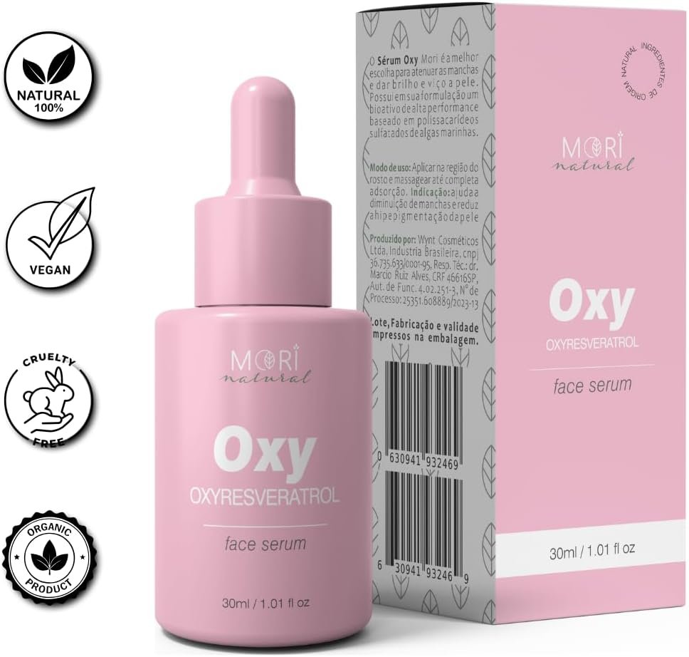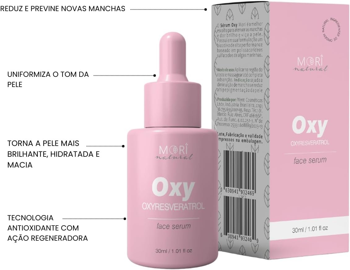 O Mori Natural Sérum Facial Redutor de Manchas Oxyresveratrol – 30ml promete reduzir a aparência de manchas escuras, uniformizar o tom da pele, hidratar e proteger contra os radicais livres. O principal ingrediente é o Oxyresveratrol, um poderoso antioxidante derivado de uma planta. Outros ingredientes importantes são o ácido hialurônico (para hidratação) e extratos vegetais com ação clareadora.